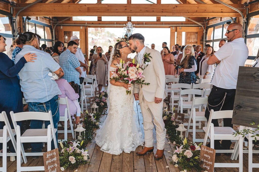 The Skyview Pavilion, with its warm wood interior and panoramic mountain-facing windows, transformed as Melissa Timm Designs installed lush florals in shades of blush, burgundy, mauve, and cream. The triangle-shaped boho arbor from Marsh Made Designs created a breathtaking focal point that paired perfectly with the natural wood backdrop.